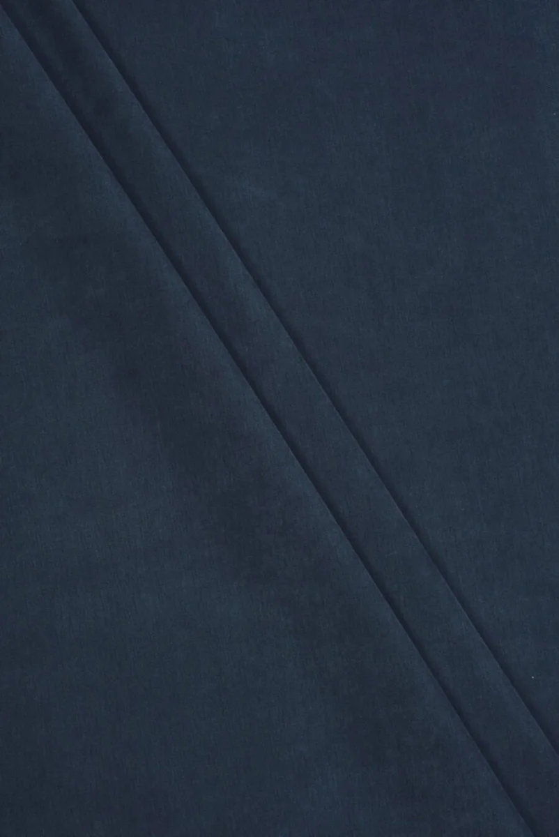 Marineblaues Cupro-Gestrick, gewebt aus einer Mischung aus Baumwolle, Polyester und Elasthan. Das Material ist fleischig, schwer, fließend, flexibel und sehr angenehm in der Hand. Es ist perfekt für Kleider, Röcke, Blusen, Jumpsuits.