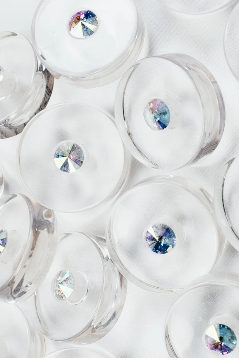 Haar, transparenter Knopf mit einem Durchmesser von 3 cm und einer Dicke von 0,9 cm. Zusätzlich ist sie im Inneren mit einem Hologrammstein verziert, der in verschiedenen Farben schimmert – je nach Lichteinfallswinkel. Der Knopf ist sehr effektiv und leicht. Aufgrund seiner Größe eignet es sich ideal zur Aufwertung eines Mantels, einer Jacke, einer Weste oder einer Jacke.