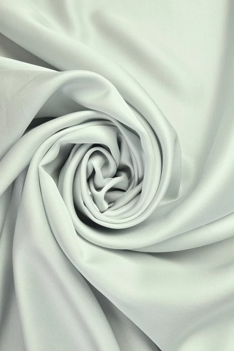Cadi-Seide in hellgrauer Farbe mit einem Gewicht ähnlich wie Satin. Bedeckendes, fließendes, seidenmattes Gewebe. Wir empfehlen es zum Nähen von eleganten Blusen, Röcken, formellen Kleidern.