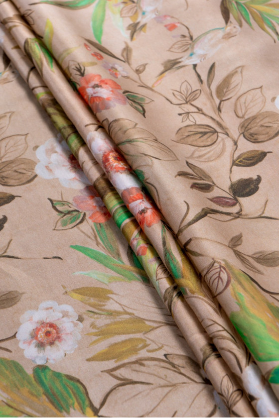 Italienisches Viskosegewebe von sehr guter Qualität. Blumenmotiv auf beigem Hintergrund. Farben: beige, grün, weiß, khaki, orange, braun.