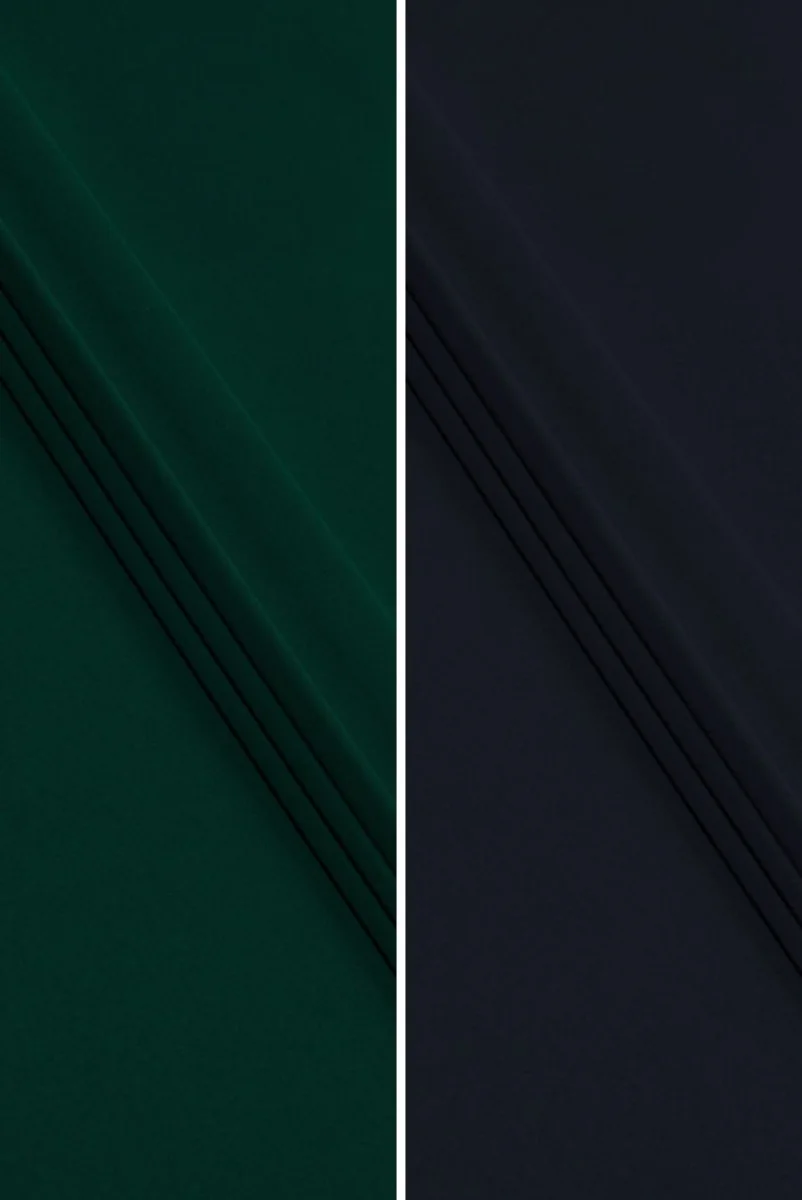 Italienischer Cadi-Viskosestoff in zwei Farben - Flaschengrün und sehr dunkles Marineblau. Der Stoff des Cadi-Kleides ist blickdicht, fleischig, fließend, schwer, matt und elastisch. Sie können damit Kleider, Blusen, Röcke, Hosen und Kostüme nähen.
