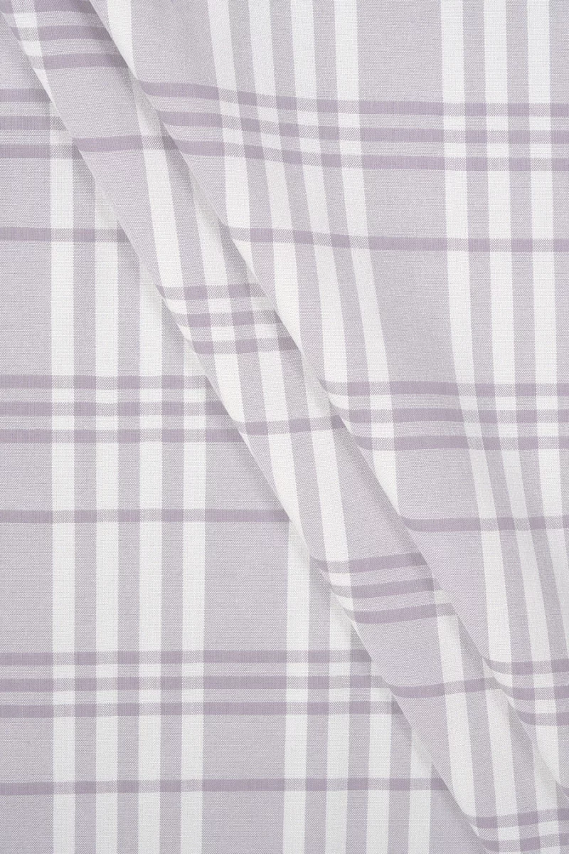 Italienischer Stoff aus 100 % Viskose mit grau-violettem Karomotiv (4 cm) auf cremefarbenem Hintergrund. Viskose ist ein aus Zellulose gewonnener Stoff, der sehr atmungsaktiv und weich ist, hautfreundlich (nicht allergen) ist und Feuchtigkeit perfekt aufnimmt.