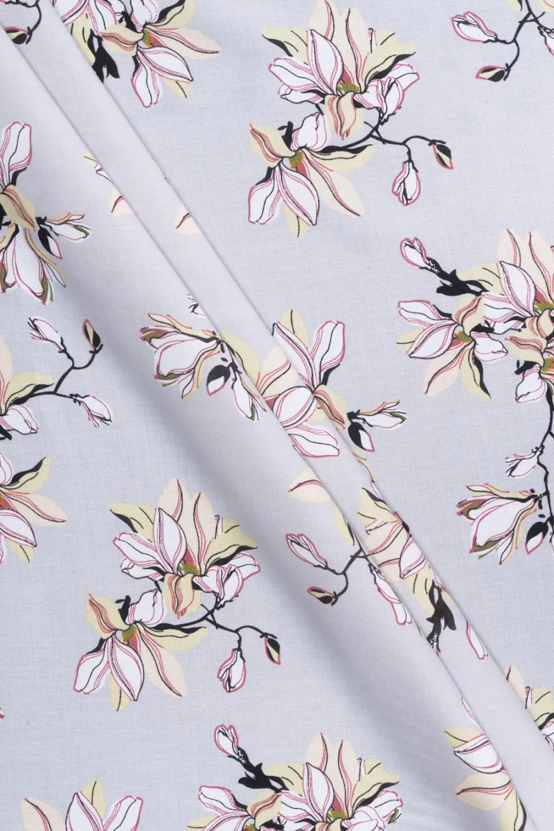 Italienischer Stoff 100% Viskose in grauer Farbe mit einem dichten Blumenmotiv. Die Blüten haben eine Größe von 10 cm bis 15 cm und sind in den Farben Ecru, Beige und Schwarz mit burgunderfarbenen Bordüren gehalten. Der Stoff ist dünn, unelastisch mit einem Leinwandgewebe. Ein sehr subtiler Vorschlag zum Nähen eines Sommerkleides, einer Bluse oder eines Rocks.