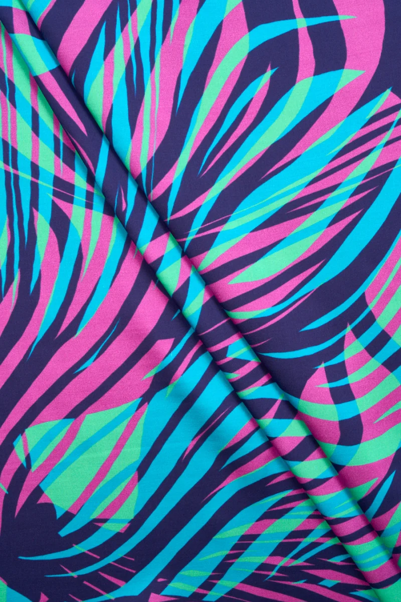 Italienischer Stoff 100% Viskose mit einem unregelmäßigen Wellenmuster in den energetischen Farben Fuchsia, Türkis und Grün. Der Stoff ist satiniert, weich, fließend, leicht und fühlt sich sehr angenehm an. Ein perfektes Angebot für einzigartige Outfits wie Kleider, Röcke, Blusen und Hemden.