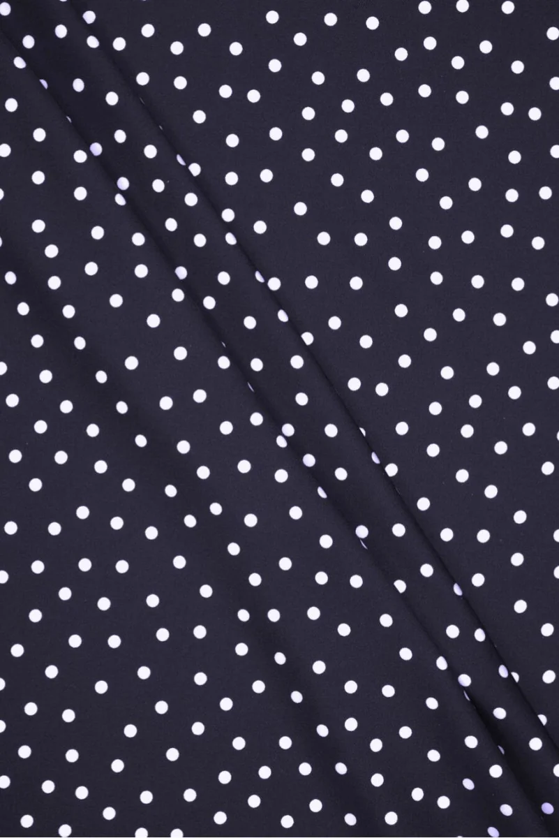 Italienischer Stoff aus 100 % Viskose in Marineblau mit einem Motiv aus cremigen, kleinen Tupfen. Das Muster ist dicht und die Punkte von 0,6 cm sind unregelmäßig verteilt. Der Stoff ist dünn, aber blickdicht, nicht elastisch, weich und fließend. Es eignet sich perfekt zum Nähen eines Sommerkleides, eines Rocks, einer Bluse oder einer weiten Hose. Ein idealer Stoff für Menschen, die zeitlose Muster in klassischen Farben mögen.