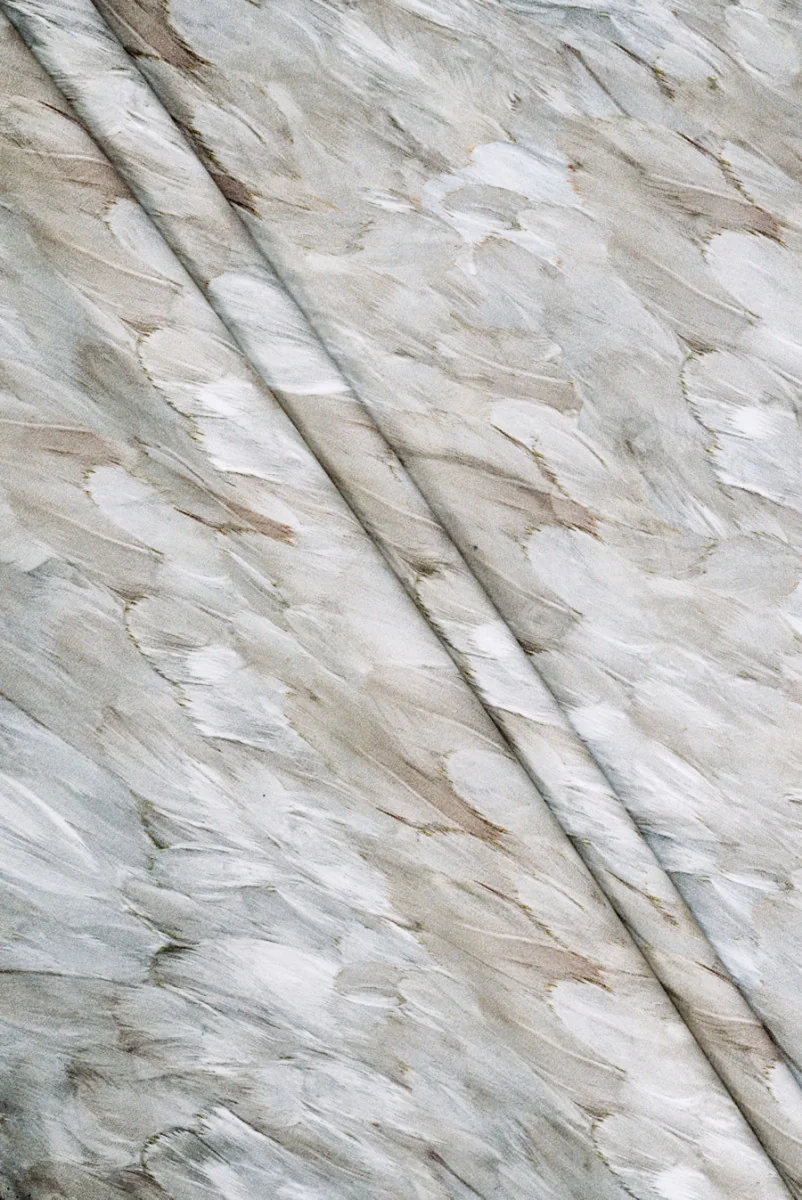 Italienischer Cadi-Stoff, gewebt aus 100 % Viskose mit einem Motiv zarter, beigefarbener Federn. Das mittelgroße Muster ist sehr dicht und leicht verschwommen, eine Feder ist zwischen 3 cm und 7 cm lang. Der Stoff ist fleischig, undurchsichtig, fließend, ziemlich schwer und unflexibel. Ein Vorschlag für Menschen, die Materialien in ruhigen Farben und Designs für Kleider, lockere Hosen, Röcke und sogar einen Overall suchen.