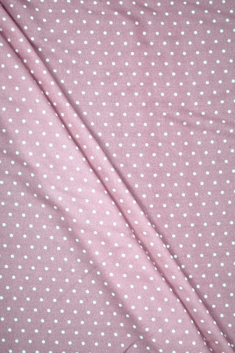 Italienischer Stoff aus 100% Viskose in Flieder-Rosa mit Tupfenmotiv. Das Muster kommt in cremefarbener Farbe und hat einen Durchmesser von 0,3cm. Er befindet sich dicht und regelmäßig. Der Stoff ist unelastisch, weich und mit einem Georgette-Gewebe verbunden. Hergestellt aus 100% Naturfasern, eignet es sich perfekt zum Nähen von Frühlings- und Sommerkleidung. Super Stoff für Fans von zeitlosen Mustern.