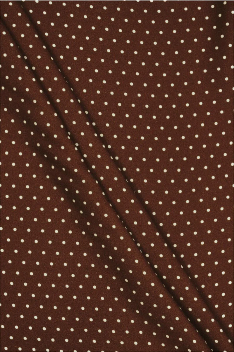 Italienischer Stoff aus 100% Viskose in Braun mit Tupfenmotiv. Das Muster kommt in cremefarbener Farbe und hat einen Durchmesser von 0,3cm. Er befindet sich dicht und regelmäßig. Der Stoff ist unelastisch, weich und mit einem Georgette-Gewebe verbunden. Hergestellt aus 100% Naturfasern, eignet es sich perfekt zum Nähen von Frühlings- und Sommerkleidung. Super Stoff für Fans von zeitlosen Mustern.