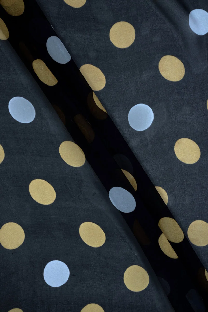 Italienischer Viskose-Musselin mit einem Hauch von natürlicher Seide mit Erbsenmotiv. Das Muster besteht aus spärlich verteilten, großen Polka Dots mit einem Durchmesser von 4 cm in Grau und Gelb auf schwarzem Hintergrund. Das Material ist zart, transparent, sehr leicht und luftig, zusätzlich mit einem dezenten Glanz veredelt. Ein subtiles und zartes Angebot für den Sommer, aus dem Sie Kleider mit Rüschen, luftige Röcke, leichte Blusen und Schals zaubern können.
