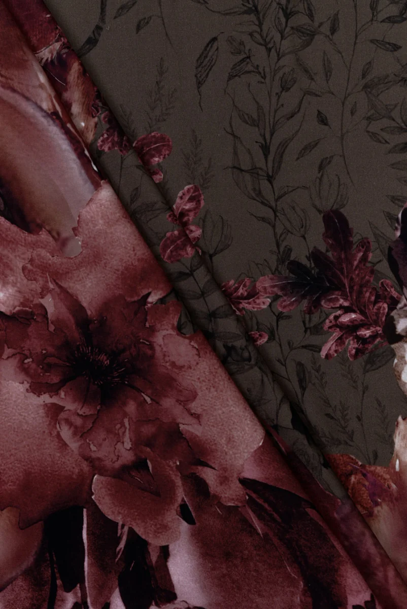Stoff aus 100 % Viskose mit herbstlichem Blumenmotiv auf dunklem olivgrünem Hintergrund. An einer Stoffkante befinden sich große Muster aus Blüten und Blättern in Burgunderrosa, im längsten Fragment sind sie 68 cm hoch - wir empfehlen umlaufendes Nähen. Der Hintergrund ist mit zarten Umrissen skizzierter Vegetation gefüllt, die subtil und dicht angelegt sind. Der Stoff ist fließend, matt, unelastisch und glatt gewebt. Es ist perfekt für Kleider, Röcke oder weite Hosen.