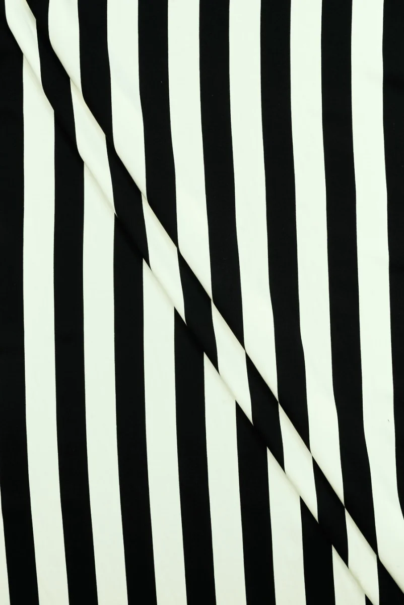 Italienischer Viskosestoff mit Streifenmotiv in Schwarz und Beige. Das Muster ist 2,5 cm breit, symmetrisch und vertikal angeordnet. Das Material ist dünner, aber blickdicht, weich und fließend. Es eignet sich perfekt zum Nähen eines Hemdes, einer Bluse, eines weiten Rocks oder eines Kleides. Die natürliche Zusammensetzung macht es sehr angenehm zu verwenden.