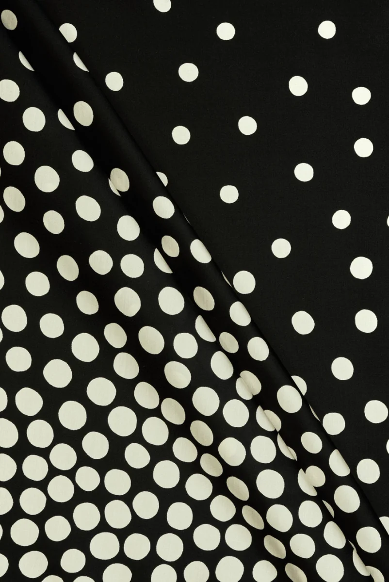 Italienischer Viskosestoff mit Tupfenmotiv. Das Muster ist auf schwarzem Hintergrund gedruckt, ist in der Mitte des Stoffes spärlich und verdickt sich zu beiden Stoffkanten. Die Polka Dots sind in der Farbe écru gehalten und haben einen Durchmesser von 1,5 m. Das Material ist dünner, aber blickdicht, weich und fließend mit einer satinierten, glatten, leicht glänzenden Webart. Es eignet sich perfekt zum Nähen eines Hemdes, einer Bluse, eines weiten Rocks oder eines Kleides. Die natürliche Zusammensetzung macht es sehr angenehm zu verwenden.