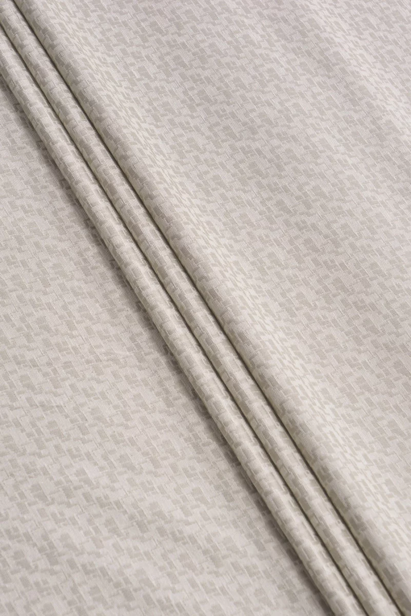 Italienischer Jacquard-Kostümstoff in hellem, kaltem Beige mit einem leicht glänzenden Faden, der ihm Eleganz verleiht. Ein interessantes Motiv aus kleinen Würfeln.