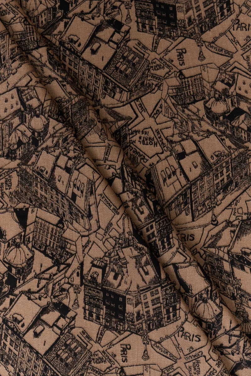 Italienischer Jacquard-Kostümstoff, der einen Stadtplan auf einem Kamelhintergrund darstellt. Ein dichtes, sich wiederholendes Muster in Schwarz zeigt verschiedene Arten von Gebäuden und Straßen mit ihren Namen. Der Stoff ist weich, elastisch, blickdicht und fällt gut. Es eignet sich perfekt zum Nähen von Kostümen, Kleid, Rock und Hosen.