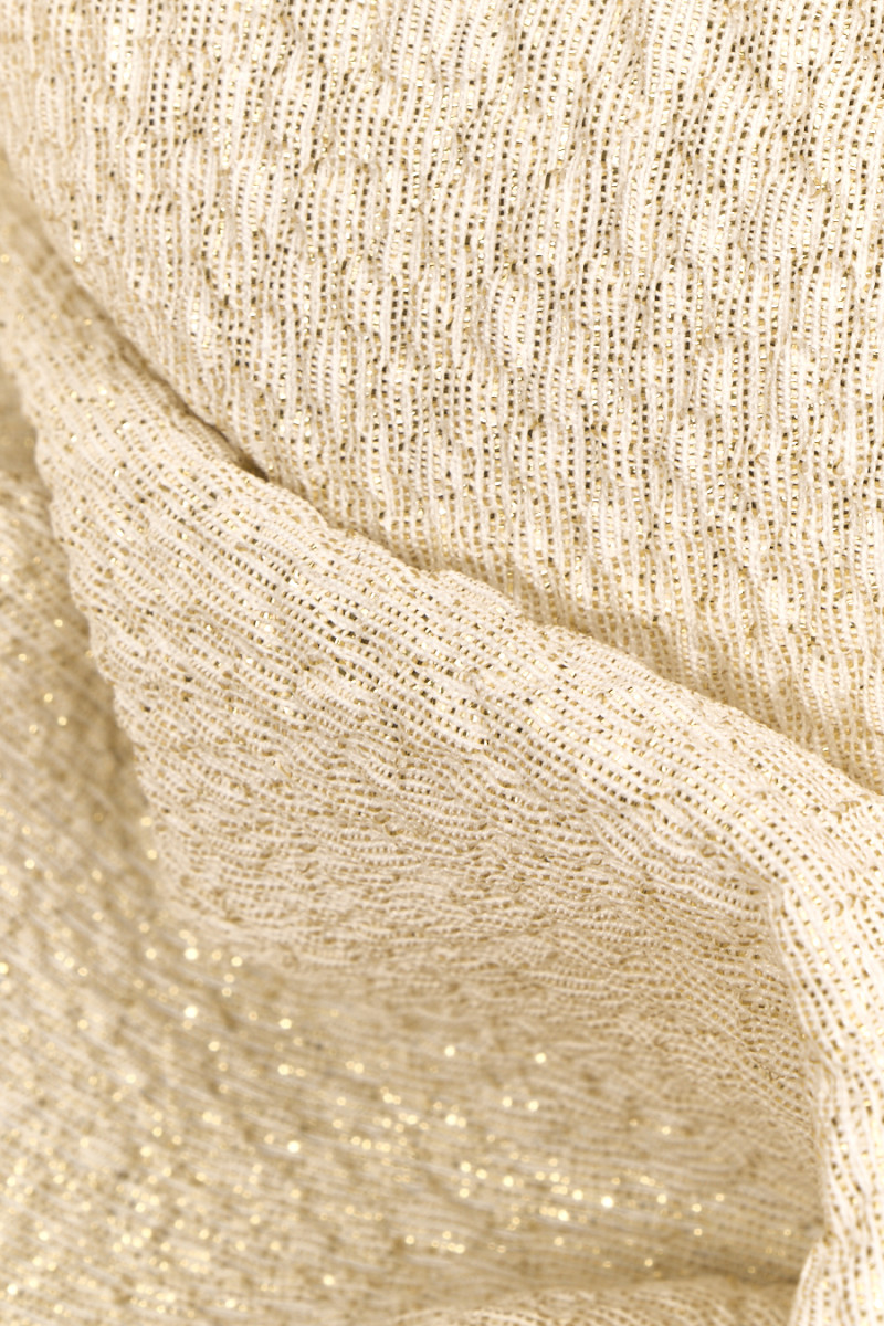 Italienischer Jacquardstoff in Cremefarbe, dicht verziert mit goldenem, glänzendem Faden. Der Stoff ist weich, leicht, mit einer konvexen Struktur, die Schlangenhaut ähnelt und über die gesamte Länge des Stoffes elastisch ist. Ein schönes Angebot zum Nähen eines Kleides, eines Rocks und einer Jacke für besondere Anlässe.