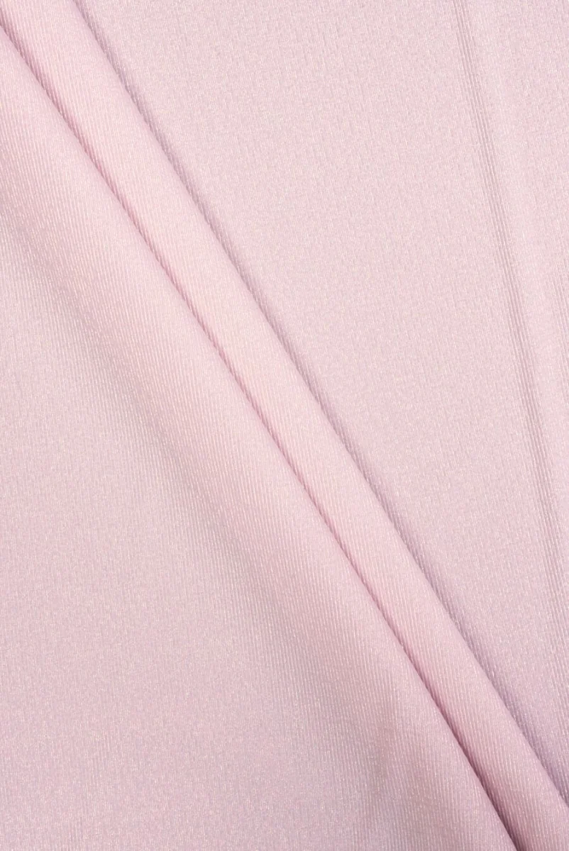 Polyester-Jacquard-Stoff mit einem Motiv aus zarten und feinen Streifen, die über die gesamte Breite des Stoffes in rosa Farbe angeordnet sind. Das Ganze ist dicht mit einem schillernden grünen und gelben Faden verziert, der ebenfalls über die Breite des Stoffes gelegt ist. Das Material ist von mittlerer Dicke, ein wenig elastisch entlang der Länge, blickdicht und sitzt leicht steif. Es ist unglaublich vielseitig, Sie können es verwenden, um Kostüme, Kleider, Röcke, Jacken, leichte Mäntel und sogar Hosen zu nähen.