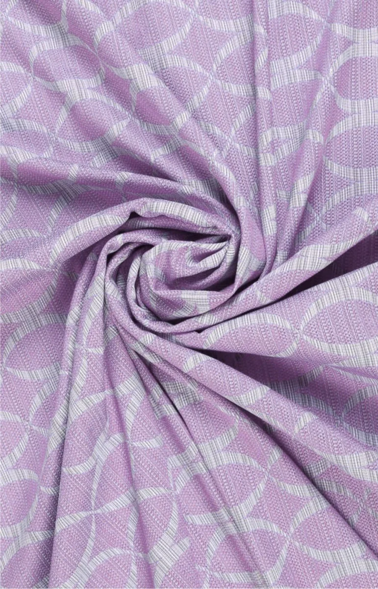 Italienischer Jacquard Trachtenstoff in Lila. Der Stoff hat ein Wellenmuster in Grau mit einem grün glänzenden Faden. Das Motiv erzeugt regelmäßige, ovale Muster mit den Maßen 10cm* 7cm, die vertikale und horizontale Streifen bilden.